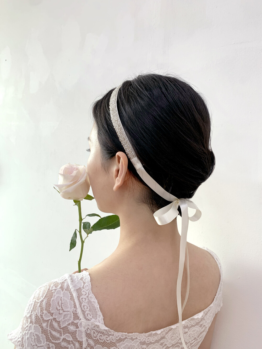 새틴리본은 뒤로 묶어 늘어뜨려주세요.